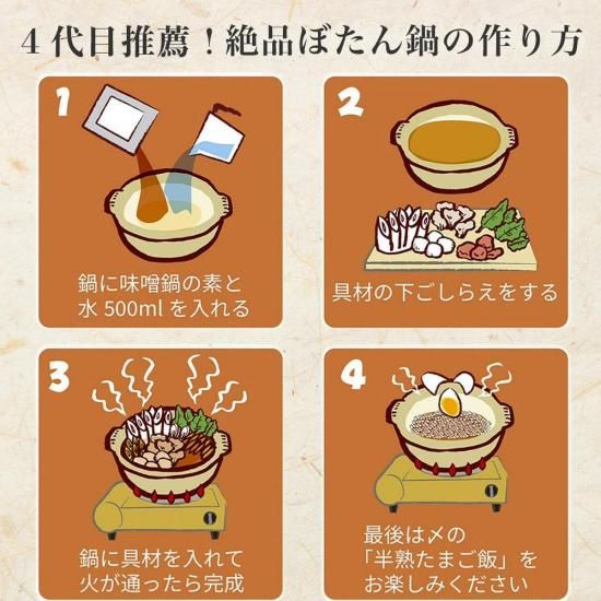 まずは、味噌鍋の素と水500ccを鍋に入れ、煮立たせます。最初に、きのこを入れて軽く煮立たせた後、野菜を入れます。白菜が少ししんなりしたら、ぼたん肉を入れてください。火が通りましたら完成です。〆にはきしめんをご用意しております。つるつる・もちもちの食感とつるつるした喉越しをお楽しみいただけます。