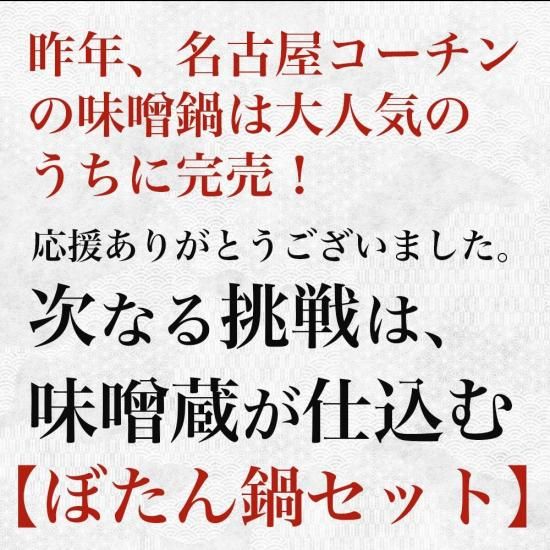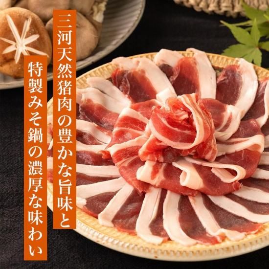三河山里の味。ぼたん鍋を堪能できるお鍋セットとなっております。味噌は100年味噌蔵の3年熟成豆みそを使用しております。